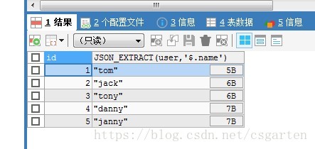 SELECT id,JSON_EXTRACT(USER,'$.name')FROM test;