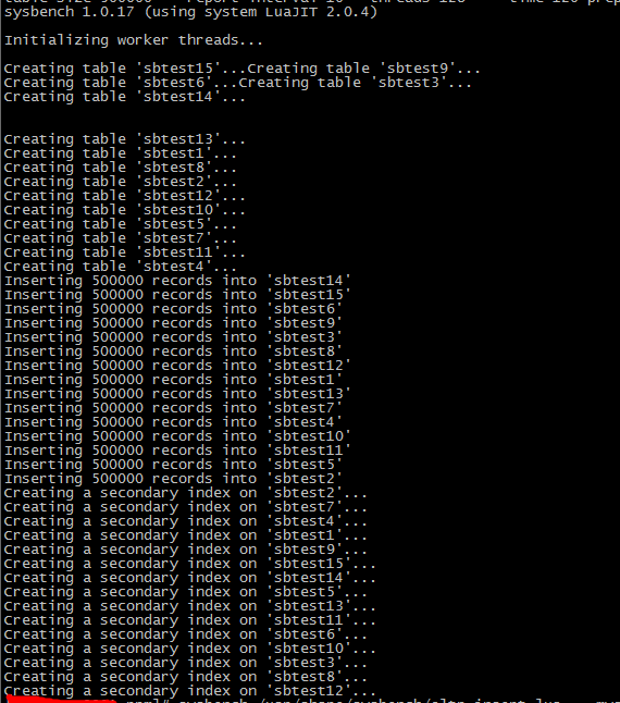 sysbench /usr/share/sysbench/oltp_insert.lua --mysql-host=XXX.XXX.XXX.XXX --mysql-port=3306 --mysql-user=testsbuser --mysql-password='textpwd' --mysql-db=tssysbench --db-driver=mysql --tables=15 --table-size=500000 --report-interval=10 --threads=128 --time=120 prepare