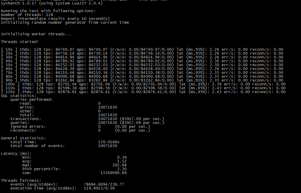 sysbench /usr/share/sysbench/oltp_insert.lua --mysql-host=XXX.XXX.XXX.XXX --mysql-port=3306 --mysql-user=testsbuser --mysql-password='testpwd' --mysql-db=tssysbench --db-driver=mysql --tables=15 --table-size=500000 --report-interval=10 --threads=128 --time=120 run >> ./mysysbench.log