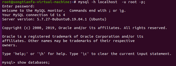 下面进入mysql,跟cmd一样,mysql -h localhost - u root -p 然后输入sudo的密码即可。