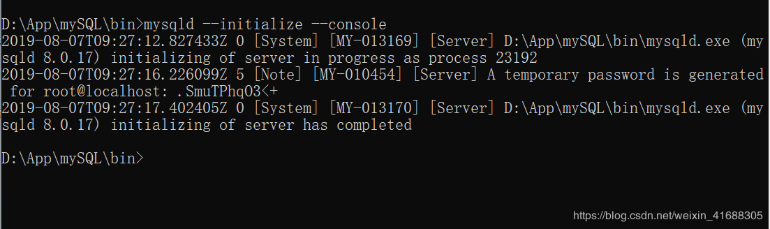 输入命令mysqld --initialize --console回车,出现如下字段,其中root@localhost:后面紧跟着的字段为初始密码,复制保存!
