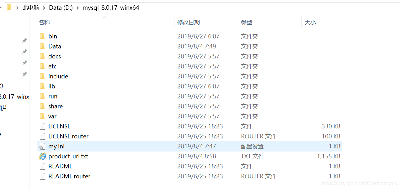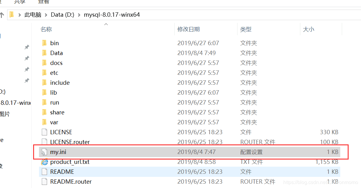 在MySQL文件夹D:\mysql-8.0.17-winx64中新建一个my.ini文件,写入如下信息:
