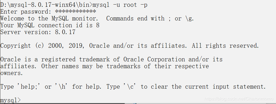 在MySQL的安装目录D:\mysql-8.0.17-winx64\bin中输入