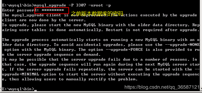我这里端口是3307,所以执行命令:mysql_upgrade -P 3307 -uroot -p ,回车,输入上个版本root的密码