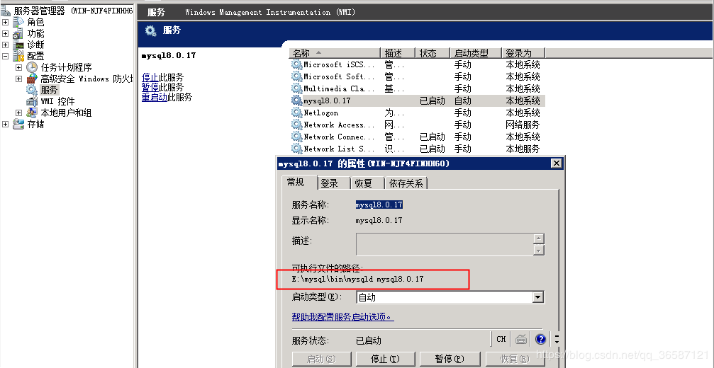 4、将mysql8.0.17的服务添加到win的服务队列中,并且启动mysql服务