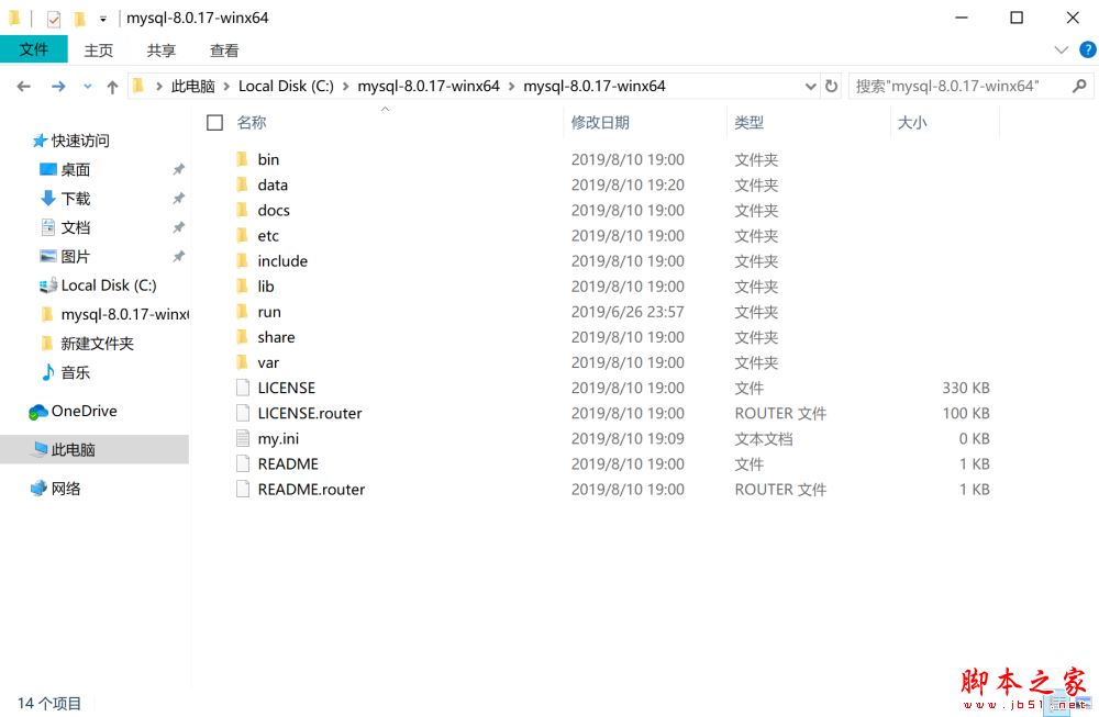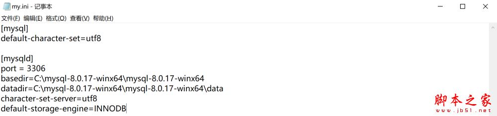 打开刚刚解压的文件夹 C:\mysql-8.0.17-winx64\mysql-8.0.17-winx64 ,创建一个配置文件为 my.ini,编辑 my.ini 配置以下基本信息: