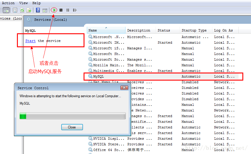 7、打开运行窗口输入:services.msc 找到MySQL并设置启动。