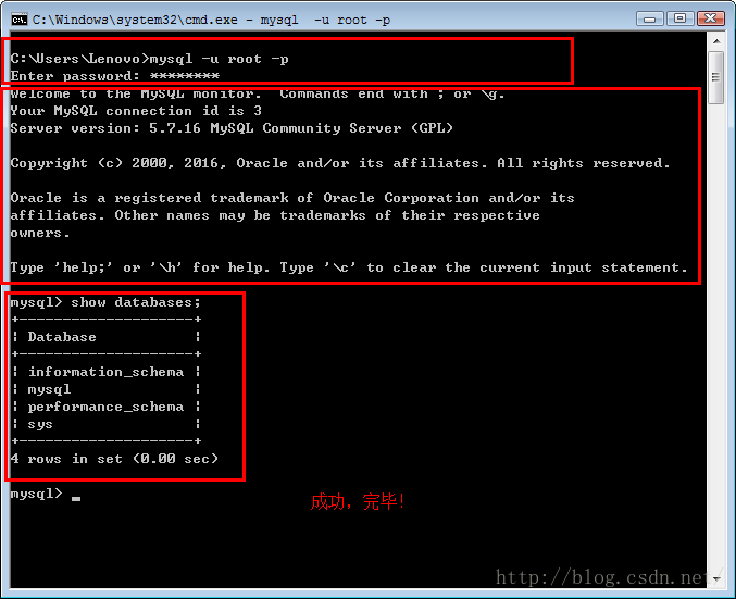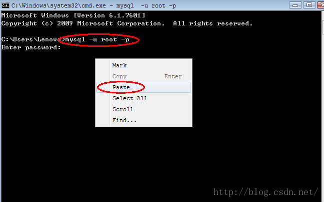 10、在cmd中继续输入mysql -u root -p 回车(或者按向上箭头),右键粘贴刚才复制的密码。