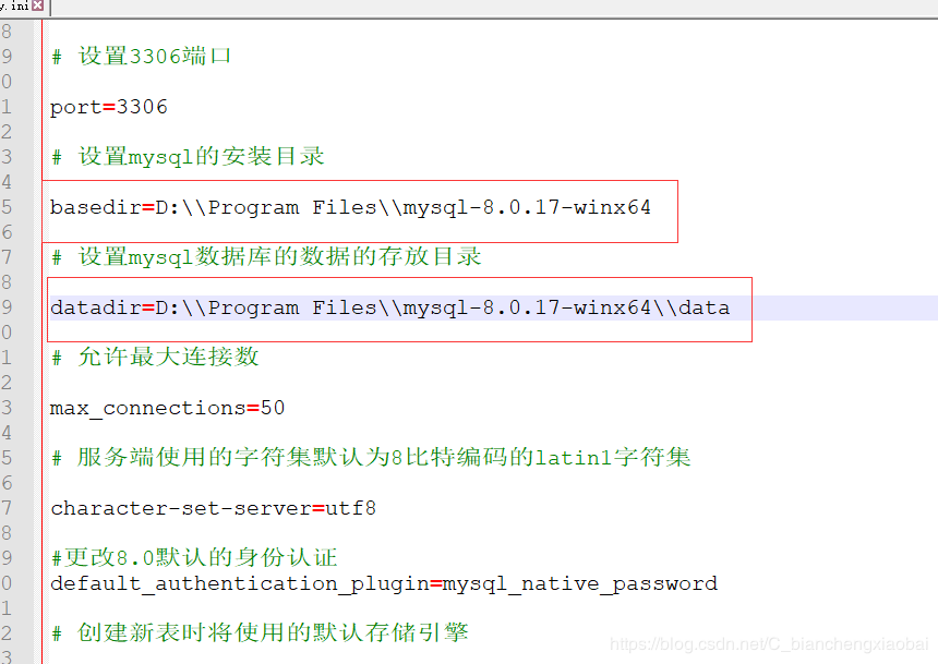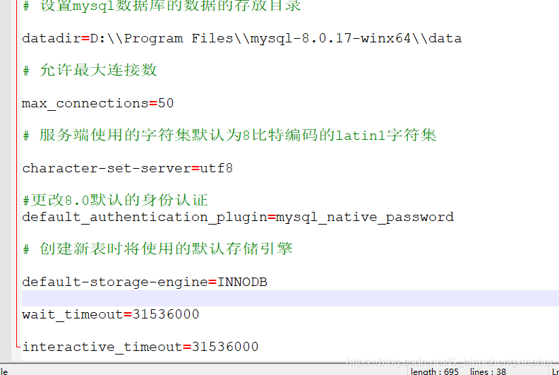 [mysql] #设置mysql客户端默认字符集 default-character-set=utf8 [mysqld] #设置3306端口 port=3306 #设置mysql的安装目录 basedir=D:\Program Files\mysql-8.0.17-winx64 #设置mysql数据库的数据的存放目录 datadir=D:\Program Files\mysql-8.0.17-winx64\data #允许最大连接数 max_connections=50 #服务端使用的字符集默认为8比特编码的latin1字符集 character-set-server=utf8 #更改8.0默认的身份认证 default_authentication_plugin=mysql_native_password #创建新表时将使用的默认存储引擎 default-storage-engine=INNODB wait_timeout=31536000 interactive_timeout=31536000