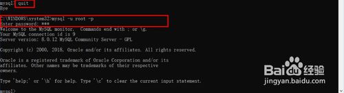 这时候就可以执行 quit 命令退出数据库,然后重新执行上一步 mysql -u root -p 然后输入密码重新登陆数据库了。这是就是完全是与你的数据库了。账号是root,密码是123。如果只是把这数据库用来开发不用设置很难的密码,因为密码忘了的话,就只剩一条路了,完全卸载干净再重装mysql。