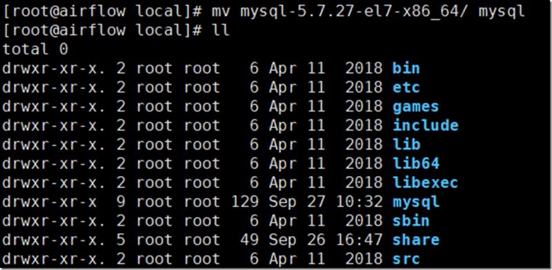cd /usr/local/ mv mysql-5.7.27-el7-x86_64/ mysql