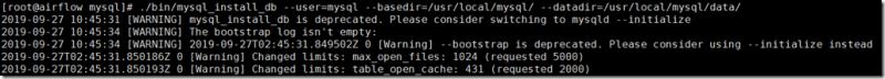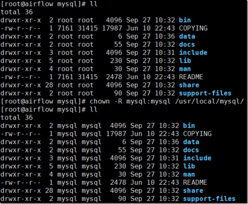 [root@airflow mysql]# groupadd mysql [root@airflow mysql]# useradd -r -s /sbin/nologin -g mysql mysql -d /usr/local/mysql/
