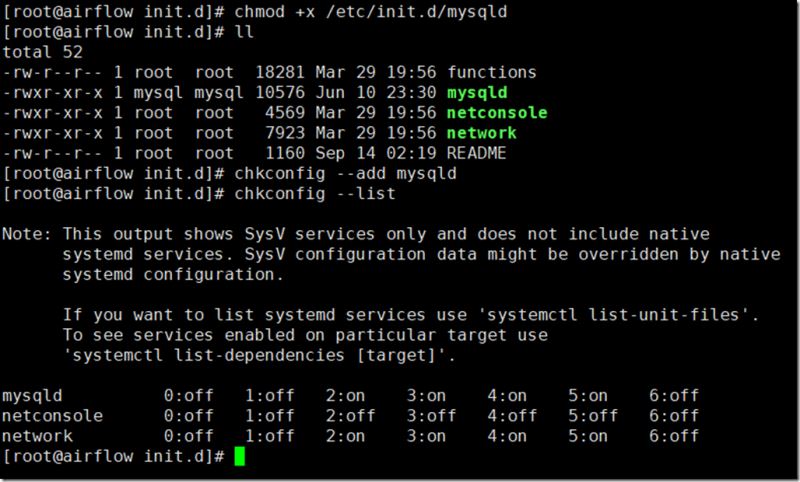 chmod +x /etc/init.d/mysqld chkconfig --add mysqld chkconfig --list