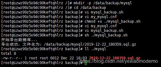 [root@izwz99z5o9dc90keftqhlrz backup]# sh ./mysql_backup.sh # 查看一下结果 [root@izwz99z5o9dc90keftqhlrz backup]# ll ./mysql