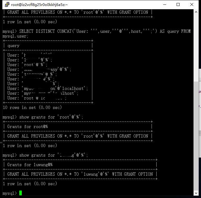 首先看一下现在系统里面有哪些用户,以及用户的具体权限,具体命令: