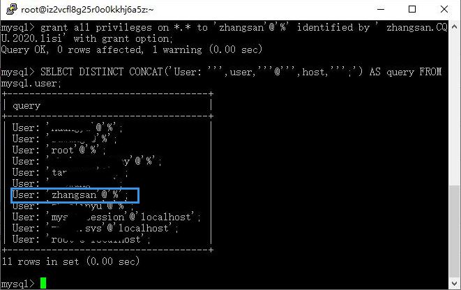 grant all privileges on *.* to 'zhangsan'@'%' identified by 'zhangsan.CQU.2020.lisi' with grant option;