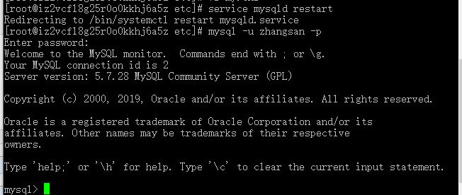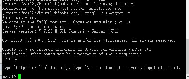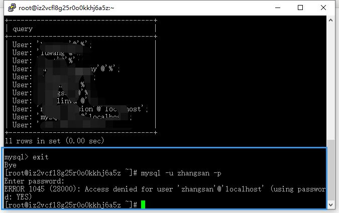 输入exit,退出MySQL,然后试着用zhangsan这个账户登录一下。
