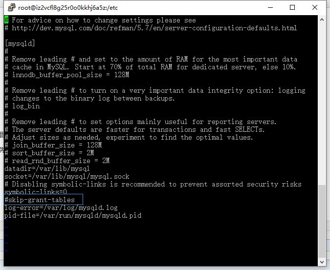 打开文件后(vi my.cnf),进入编辑模式(a)找到mysqld关键字,在mysqld下面添加skip-grant-tables,保存退出(先esc,再:wq),如图: