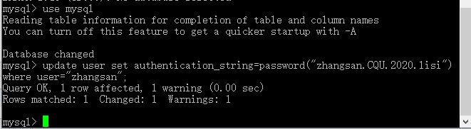 update user set authentication_string=password("zhangsan.CQU.2020.lisi") where user="zhangsan";