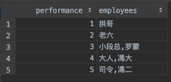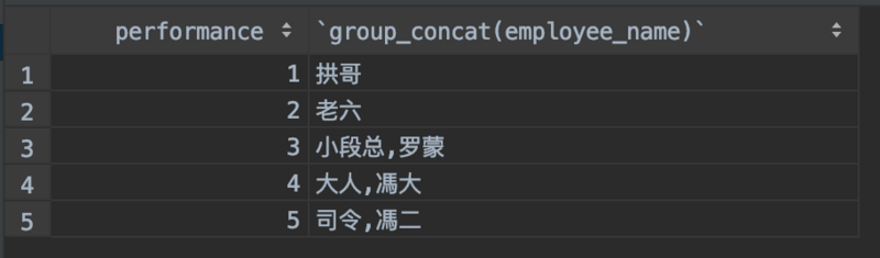 新需求来了,静悄悄的来了!!! 领导想要查看每个 performance 下都有谁,同时要求将这些人的名称要逗号拼接成一个字符串,也就是说要得到下面的结果: