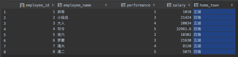 SELECT GROUP_CONCAT(DISTINCT home_town SEPARATOR '') AS '领导关怀地区' FROM employees;