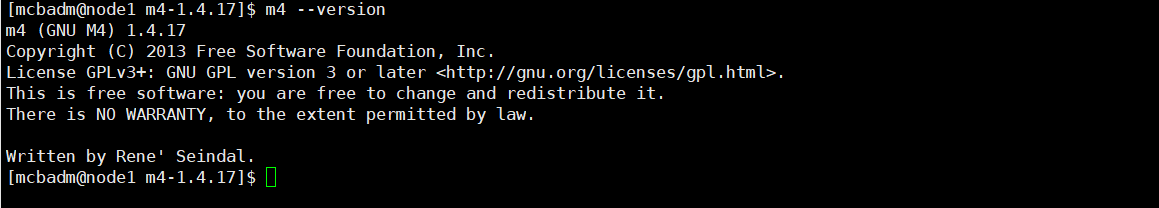tar -xzvf m4-latest.tar.gz cd m4-1.4.17/ sudo ./configure --prefix=/usr/local(--prefix指定安装路径) sudo make (编译) sudo make check (检查编译是否有错,注意是否有Error,可以不做) sudo make install (安装) m4 --version (查看m4版本)