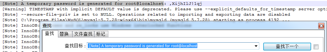 打开文件,搜索 [Note] A temporary password is generated for root@localhost:后面就是初始密码。