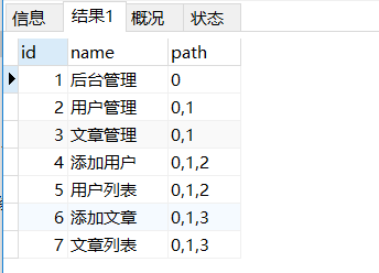 1、首先查询出所有 pid = 0 的菜单数据,并设置path 为 '0',此时cte的结果集为 pid = 0 的所有菜单数据。