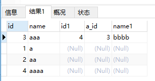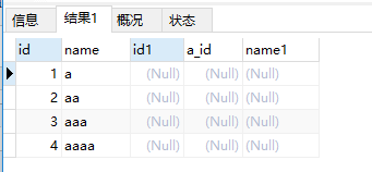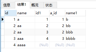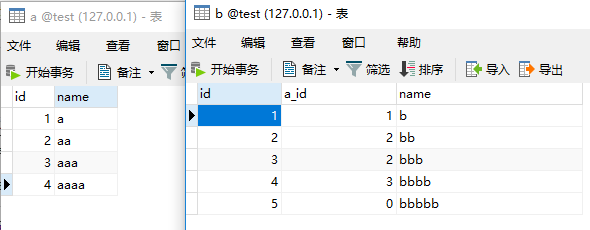 CREATE TABLE `a` ( `id` int(11) unsigned NOT NULL AUTO_INCREMENT COMMENT 'ID', `name` varchar(32) DEFAULT '' COMMENT '名称', PRIMARY KEY (`id`) ) ENGINE=InnoDB DEFAULT CHARSET=utf8; CREATE TABLE `b` ( `id` int(11) unsigned NOT NULL AUTO_INCREMENT COMMENT 'ID', `a_id` int(11) DEFAULT '0' COMMENT 'a表ID', `name` varchar(32) DEFAULT '' COMMENT '名称', PRIMARY KEY (`id`) ) ENGINE=InnoDB DEFAULT CHARSET=utf8;