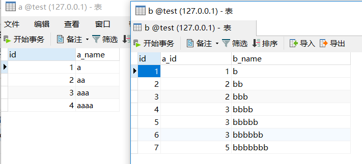 CREATE TABLE `a` ( `id` int(11) unsigned NOT NULL AUTO_INCREMENT COMMENT 'ID', `a_name` varchar(32) DEFAULT '' COMMENT 'a表名称', PRIMARY KEY (`id`) ) ENGINE=InnoDB DEFAULT CHARSET=utf8mb4; CREATE TABLE `b` ( `id` int(11) unsigned NOT NULL AUTO_INCREMENT COMMENT 'ID', `a_id` int(11) DEFAULT '0' COMMENT 'a表ID', `b_name` varchar(32) DEFAULT '' COMMENT 'b表名称', PRIMARY KEY (`id`) ) ENGINE=InnoDB DEFAULT CHARSET=utf8mb4;