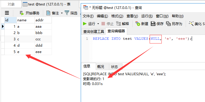 显然addr字段内容没有了,跟我们上面的分析是一致的,reaplce into先删除了id为1的记录,然后再插入记录,但我们并没有指定addr的值,所以会如上图所示那样。