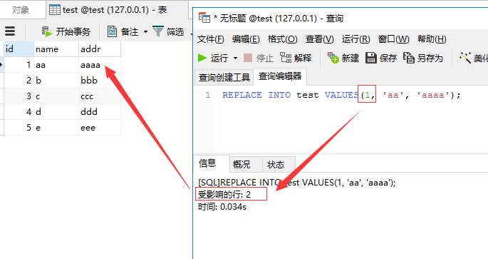 为什么会出现这种情况,原因就是replace into会首先尝试先往表里面插入记录,因为我们的ID是主键,不可重复,显然这条记录是无法插入成功的,然后replace into会把这条已存在的记录删掉,然后再插入,所以会显示影响行数是2。