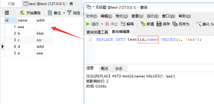 这里我们只指定id,name字段,我们来看看replace into后addr字段内容是否还存在