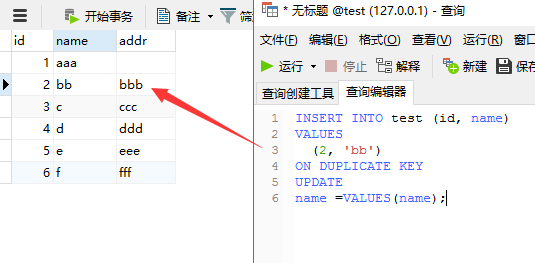 VALUES(字段名)表示获取当前语句insert的列值,VALUES(name)表示的就是'bb'
