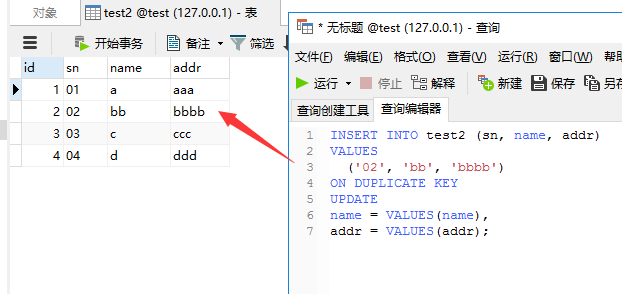 INSERT INTO test (id, name) VALUES(2, 'bb') ON DUPLICATE KEY UPDATE name = VALUES(name);