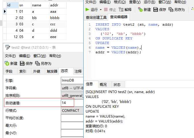 但是有些时候我们的需求是,如果记录存在则更新指定字段的数据,原有字段数据仍保留,而不是上面所示的,addr字段数据没有了。
