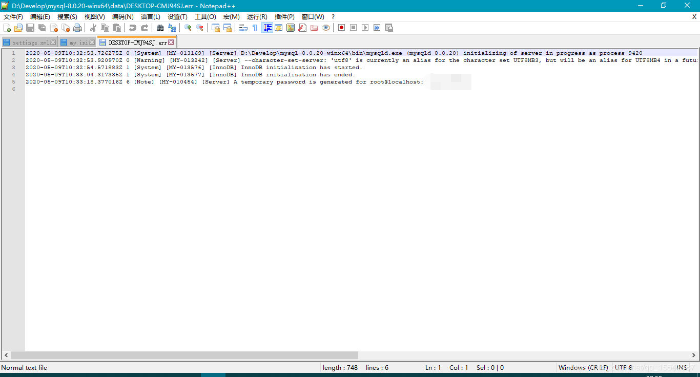1、输入命令初始化mysql的data数据目录,初始化完毕后,会在解压目录下生成一个data文件夹, 在这个文件夹下有一个.err结尾的文件,打开后会有随机生成的密码。