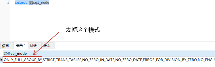 关于sql_mode,像下面这个报错,就是因为group by字段必须完全显示在查询列里,所以去掉这个模式,就不在报错了。