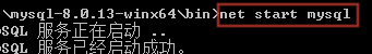 3)、输入:net start mysql如果本地已经安装过mysql,这里的服务名可以自己修改,如mysql8,但我这边测试,本地已存在mysql5.5的情况下,安装mysql8,读取到的密码还是mysql5.5的登录密码,后删除mysql5.5,正常安装mysql8.
