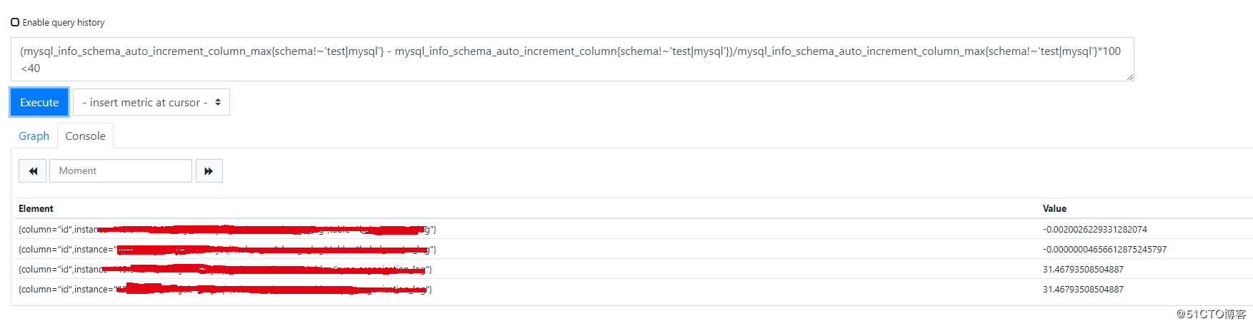 在prometheus的web界面,我们可以测试编写如下的promql, 找出剩余自增id可以率少于40%的实例的库+表名
