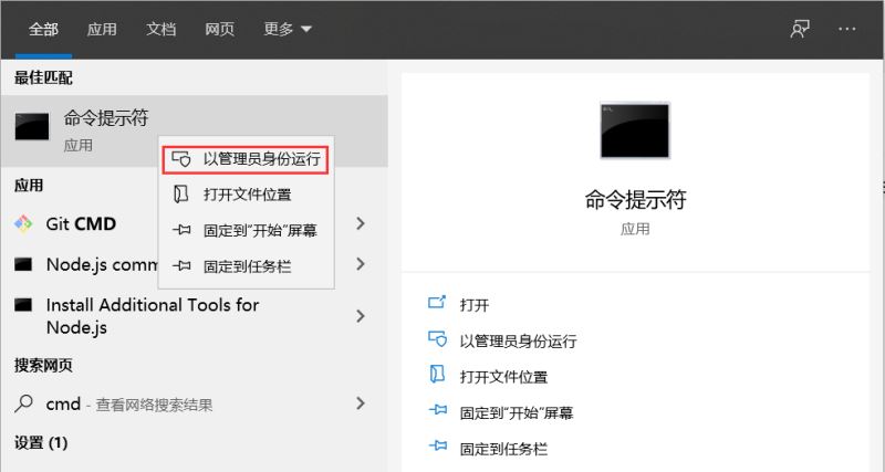 Win10搜索cmd,然后右键,选择以管理员身份运行。