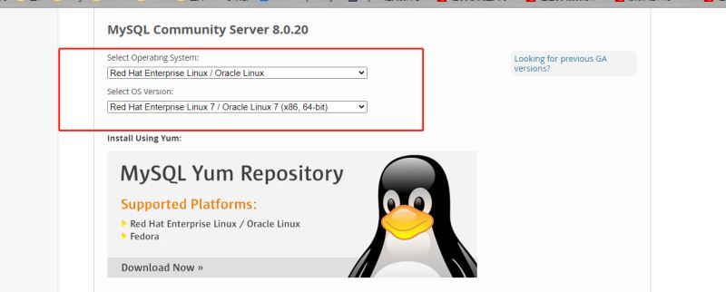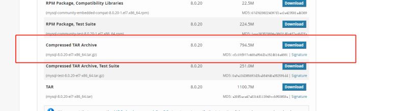 因为我使用的是CentOS 7 64位,所以在MySQL官网中选择如下图的操作系统,然后选择tar包进行下载。