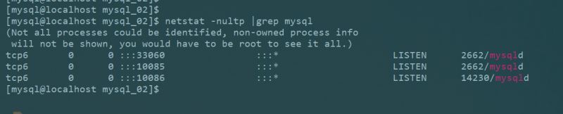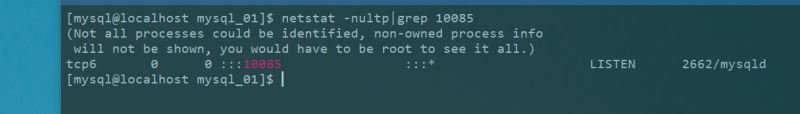 # 后台启动当前mysql_01的mysql服务,还是需要去指定配置文件,因为在配置文件中我们设置了一个socket参数, 只有按照这个配置文件去启动,才会按照socket配置的路径去生成,否则会自动生成在/tmp/mysql.sock, 如果mysql_02也是这么生成,则会形成覆盖,在连接时造成只能连接一个服务,甚至报错。 ./bin/mysqld_safe --defaults-file=./my.cnf & # 使用命令查看mysql服务是否启动,如下图 netstat -nultp|grep 10085