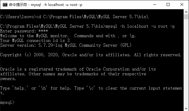 步骤 1):打开 DOS 窗口,如果你配置了 MySQL 环境变量,直接登录;没有配置环境变量就需要进入到 mysql/bin 目录下登录。如图所示。