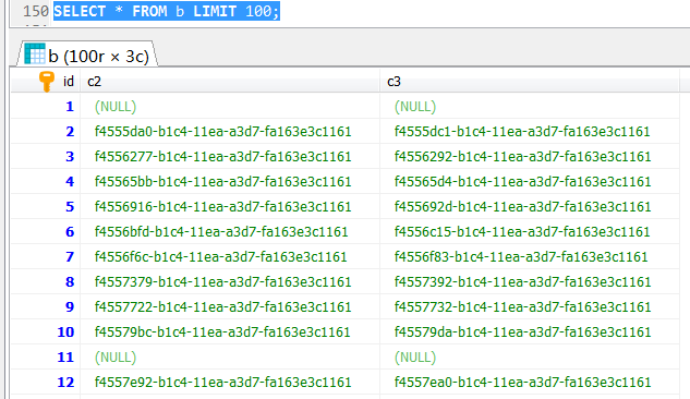 CREATE TABLE a ( id INT AUTO_INCREMENT, c2 VARCHAR(50) NOT NULL DEFAULT '', c3 VARCHAR(50) NOT NULL DEFAULT '', PRIMARY KEY (id) ); CREATE TABLE b ( id INT AUTO_INCREMENT, c2 VARCHAR(50), c3 VARCHAR(50), PRIMARY KEY (id) ); CREATE DEFINER=`root`@`%` PROCEDURE `create_test_data`( IN `loop_cnt` INT ) LANGUAGE SQL NOT DETERMINISTIC CONTAINS SQL SQL SECURITY DEFINER COMMENT '' BEGIN DECLARE v2 , v3 VARCHAR(36); START TRANSACTION; while loop_cnt>0 do SET v2 = UUID(); SET v3 = UUID(); if (loop_cnt MOD 10) = 0 then INSERT INTO a (c2,c3) VALUES(DEFAULT,DEFAULT); INSERT INTO b (c2,c3) VALUES(DEFAULT,DEFAULT); else INSERT INTO a (c2,c3) VALUES (v2,v3); INSERT INTO b (c2,c3) VALUES (v2,v3); END if ; SET loop_cnt=loop_cnt-1; END while; COMMIT;