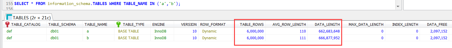 查看占用的存储空间情况,从information_schema.TABLES中查询这两个表的存储信息