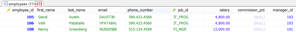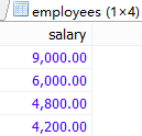 #案例3.返回其他部门中比job_id为‘IT_PROG'部门所有工资都低的员工 #的员工号,姓名,job_id以及salary。 #①先把IT_PROG部门的工资查出来。 SELECT DISTINCT salary FROM employees WHERE job_id='IT_PROG';