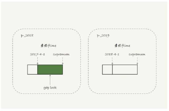 由于分区表的规则,sessionA只操作了p2018,sessionB要插入2018-2-1是可以的但要写入2017-12-1要等待sessionA的间隙锁。