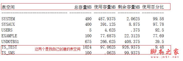 SQL> selecta.tablespace_name as 表空间, a.bytes/1024/1024 as 总容量MB ,(a.bytes-b.bytes)/1024/1024 "使用容量MB",b.bytes/1024/1024 "剩余容量MB",round(((a.bytes-b.bytes)/a.bytes)*100,2) "使用百分比" from (select tablespace_name,sum(bytes) bytes fromdba_data_files group by tablespace_name) a,(select tablespace_name,sum(bytes)bytes,max(bytes) largest from dba_free_space group by tablespace_name) b where a.tablespace_name=b.tablespace_nameorder by ((a.bytes-b.bytes)/a.bytes) desc;
