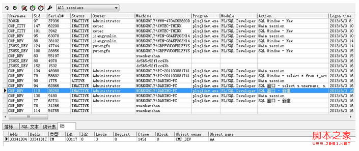 方式二:在PL/SQL环境下 工具-->会话-->All sessions 通过点击每条记录,查看下面的